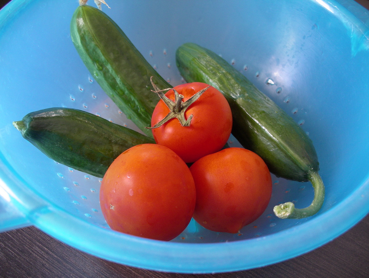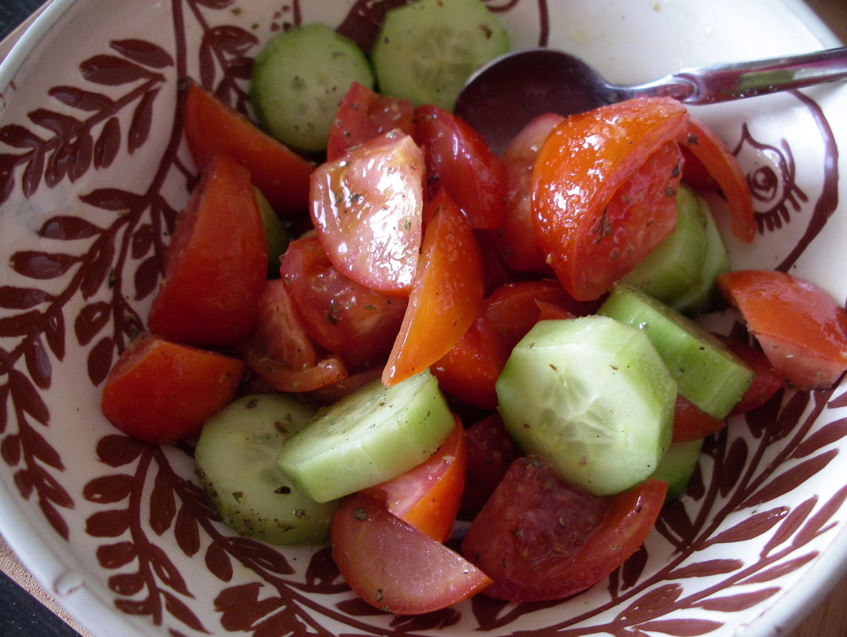 做法很簡單,蕃茄、小黃瓜切切,喜歡的話加一點細切的洋蔥,上桌前淋上比想像多三倍的橄欖油,灑上海鹽、磨點黑胡椒,也可以加上磨碎的奧勒岡香草 Oregano,拌一拌,叮咚 ♫