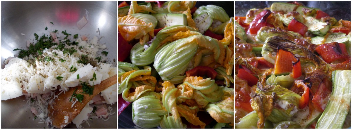 櫛瓜的花也可以食用,烹調前請小心地將花打開摘掉花蕊,輕輕沖洗後再使用,小螞蟻非常喜歡躲在櫛瓜花裡!櫛瓜花的賞味期很短,一定要趁新鮮馬上食用,在大碗裡將 Feta 飛打起司、帕瑪森起司、煎脆的培根粒及切碎的洋香菜 Parsley 拌勻,填入櫛瓜花,再加上彩椒、切段的櫛瓜、洋蔥等時令蔬果,灑上奧勒岡 Oregano、海鹽及現磨黑胡椒,淋上橄欖油,放入烤箱 180°C 焗烤至起司融化、表面金黃微焦,即可趁熱享用。